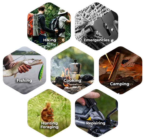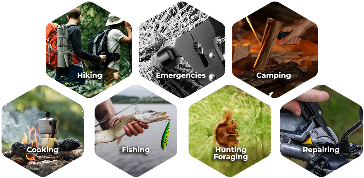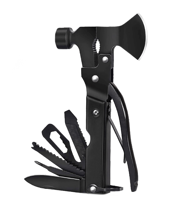 In case of an emergency and you are trapped in your car. This survival tool can help you. It can be used as an emergency hammer, you can hit the edge of the window, and all the car glass can be broken. We recommend keeping our 14-in-1 multitool hatchet in your car, and they may protect you and your beloved in times of crisis.