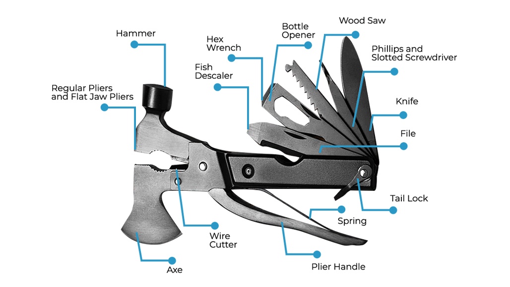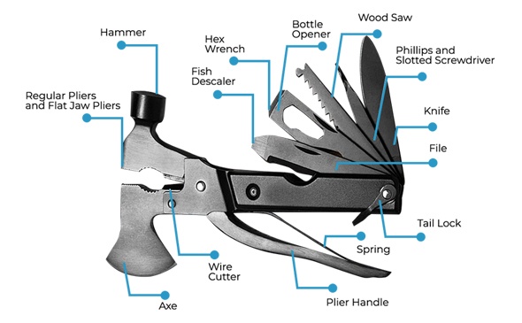 This 14-in-1 camping gear includes serrated knife, screwdriver, flat screwdriver, saw, file, bottle opener, 4 hex wrenches, pliers, rasper, wire cutters, axe and hammer. It works well during camping, exploring, fishing, field training and long-distance travel.